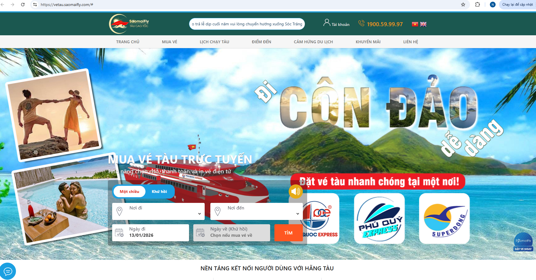 Đây là trang web đặt vé tàu đi Côn Đảo trực tuyến tập trung vào con tàu Trưng Nhị và các tàu thuộc hệ thống Phú Quốc Express. Hành khách có thể dễ dàng tra cứu tuyến Sóc Trăng - Côn Đảo hoặc các tuyến khác đi Côn Đảo, Phú Quốc, Phú Quý… theo nhu cầu. So sánh giá vé giữa các hãng tàu cùng tuyến. Thanh toán trực tuyến và nhận vé điện tử liền tay.