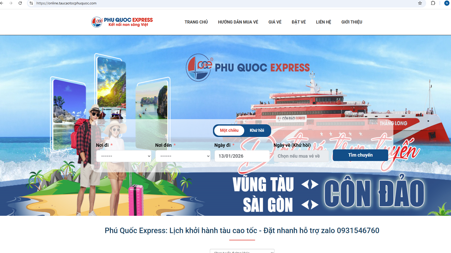 Đây là website đặt vé trực tiếp của hãng Phú Quốc Express tổng hợp các tuyến tàu cao tốc đi Côn Đảo khởi hành từ Vũng Tàu, Trần Đề (Sóc Trăng). Giao diện đặt vé trực tuyến được tích hợp tính năng hiện đại, giúp bạn dễ dàng tra cứu giá vé, so sánh vé rẻ nhất và đặt vé chỉ với 3 bước đơn giản. Hiển thị rõ giá vé theo từng loại chỗ ngồi, hỗ trợ thanh toán trực tuyến an toàn và nhận vé điện tử.