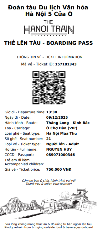 (*) Tàu 5 cửa ô Hà Nội bán vé duy nhất qua kênh du lịch, liên hệ hotline 1900599.997 hoặc zalo 0901442555 để được hỗ trợ đặt vé nhanh chóng. (Đường sắt Việt Nam không bán vé).
