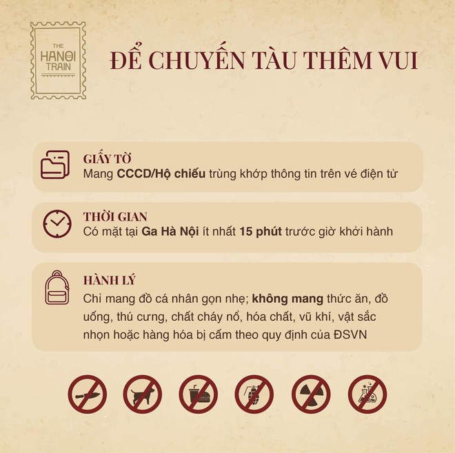 The Hanoi Train được kỳ vọng mang đến cho du khách một hành trình an toàn, tiện nghi và giàu giá trị trải nghiệm nơi nét đẹp hoài niệm của 5 cửa ô Hà Nội được tái hiện hài hòa trong không gian du lịch đường sắt hiện đại. Hotline hỗ trợ đặt vé: 1900599997 (vé được bán qua Công ty du lịch được uỷ quyền - Đường sắt Việt Nam hiện không bán vé tàu 5 cửa ô Hà Nội).