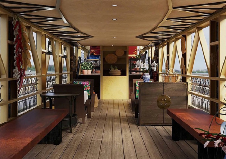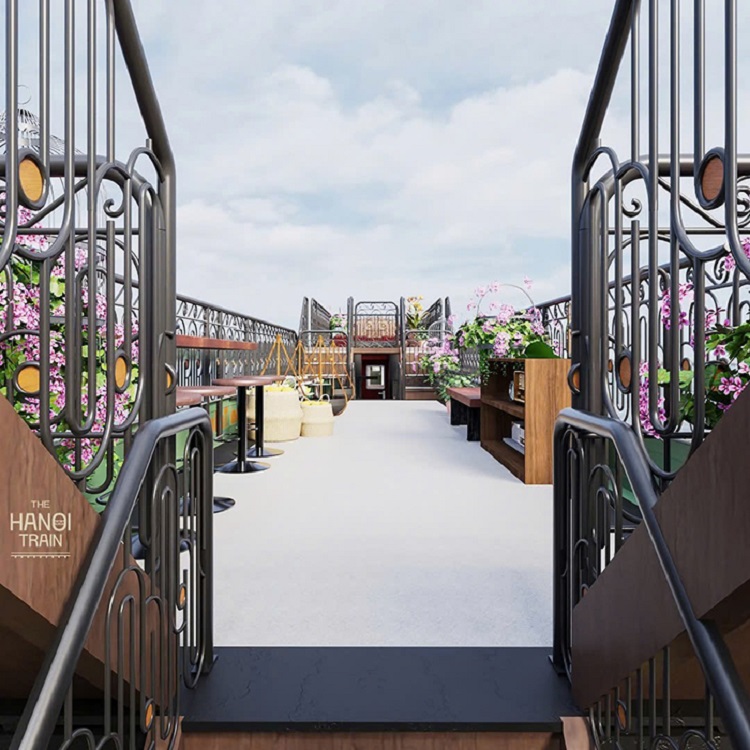 Toa tàu sử dụng gam màu vàng kem, xanh rêu và nâu gỗ chủ đạo, kết hợp với sàn gạch bông cổ điển, tạo nên bối cảnh như trong những bộ phim về Hà Nội thập niên 90. Khác với toa khách thông thường, các ô cửa sổ tại đây được mở rộng tối đa, giúp hành khách bắt trọn khoảnh khắc tàu đi qua cầu Long Biên hay những khu phố cũ mà không bị vướng tầm nhìn.