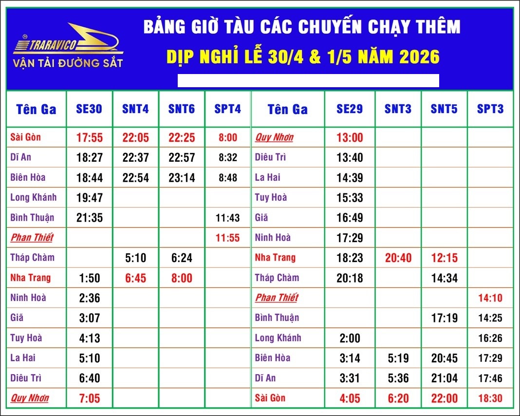 Để phục vụ nhu cầu đi lại tăng cao của người dân trong dịp nghỉ Lễ Giỗ Tổ Hùng Vương cùng kỳ nghỉ 30/4 - 01/5/2026, bên cạnh các đôi tàu chạy thường xuyên như SE1/2, SE3/4, SE5/6, SE7/8, SE9/10, SE21/22 và SNT1/2, ngành đường sắt dự kiến tăng cường thêm các chuyến tàu khu đoạn khu vực phía Nam với lịch trình cụ thể như sau: